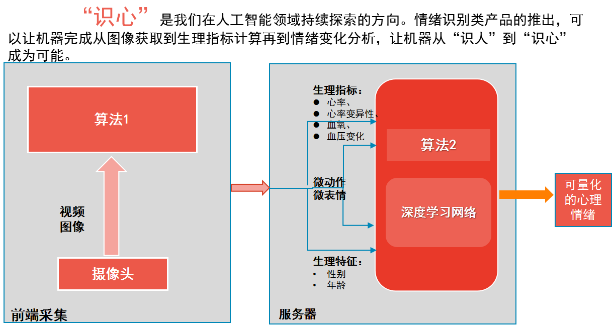 在數(shù)據(jù)分析層面,能夠在生理和情緒指標(biāo)形成生理指標(biāo)跟蹤庫(kù)和AI情緒識(shí)別庫(kù),未來(lái)賦能審訊、安防、智能駕駛、心理咨詢、醫(yī)療健康等各領(lǐng)域?qū)θ巳哼M(jìn)行橫向和縱向的生理、心理跟蹤。