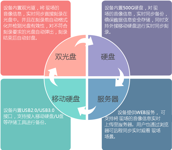 支持雙光盤和硬盤同步直刻,對(duì)現(xiàn)場(chǎng)的音視頻信息進(jìn)行獨(dú)立備份,同時(shí)可采用網(wǎng)絡(luò)和外置的USB硬盤備份。當(dāng)出現(xiàn)意外斷電或故障時(shí),錄像的內(nèi)容不會(huì)丟失,保護(hù)數(shù)據(jù)信息安全存儲(chǔ)。