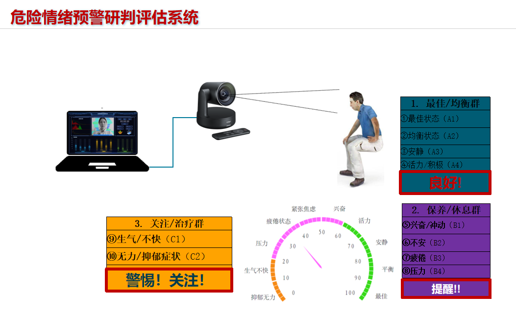 1,系統(tǒng)主動式識別四個(gè)維度的異常情緒狀態(tài),如攻擊性,心理壓力,緊張/焦慮,可疑等,系統(tǒng)最快1-3秒內(nèi)判斷風(fēng)險(xiǎn)評估值,實(shí)時(shí)預(yù)警,實(shí)時(shí)異常人員上傳至數(shù)據(jù)管理平臺。